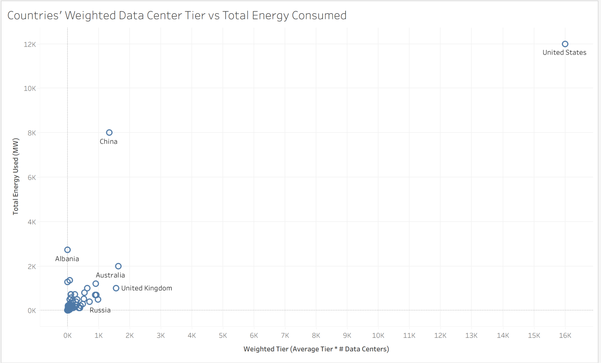 This chart is a scatterplot showing the relationship between each country’s weighted tier of data centers and the total energy consumed by data centers (in MW). Countries where the total energy consumed is unknown are excluded. Weighted Tier is the product of the average data center tier in the country and the number of data centers it has.