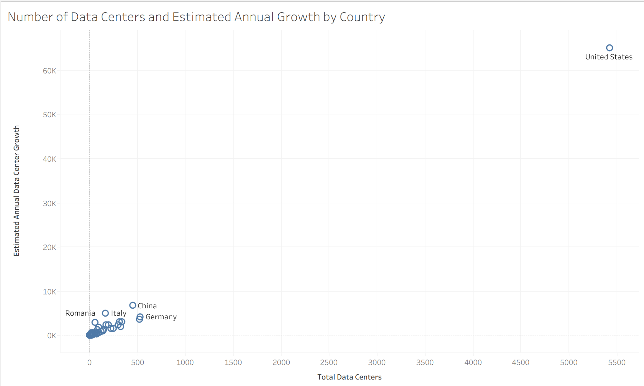 The scatter plot reveals a global data center landscape where a small group of nations such as China, Germany, UK and Australia dominate both existing infrastructure and projected growth. However, the vast majority of countries cluster near the origin, with fewer than 50 data centers and minimal growth rate. This concentration becomes even more extreme when the United States is included and its 5,400 facilities and 63,000 estimated annual growth compress every other nation into the bottom left corner.